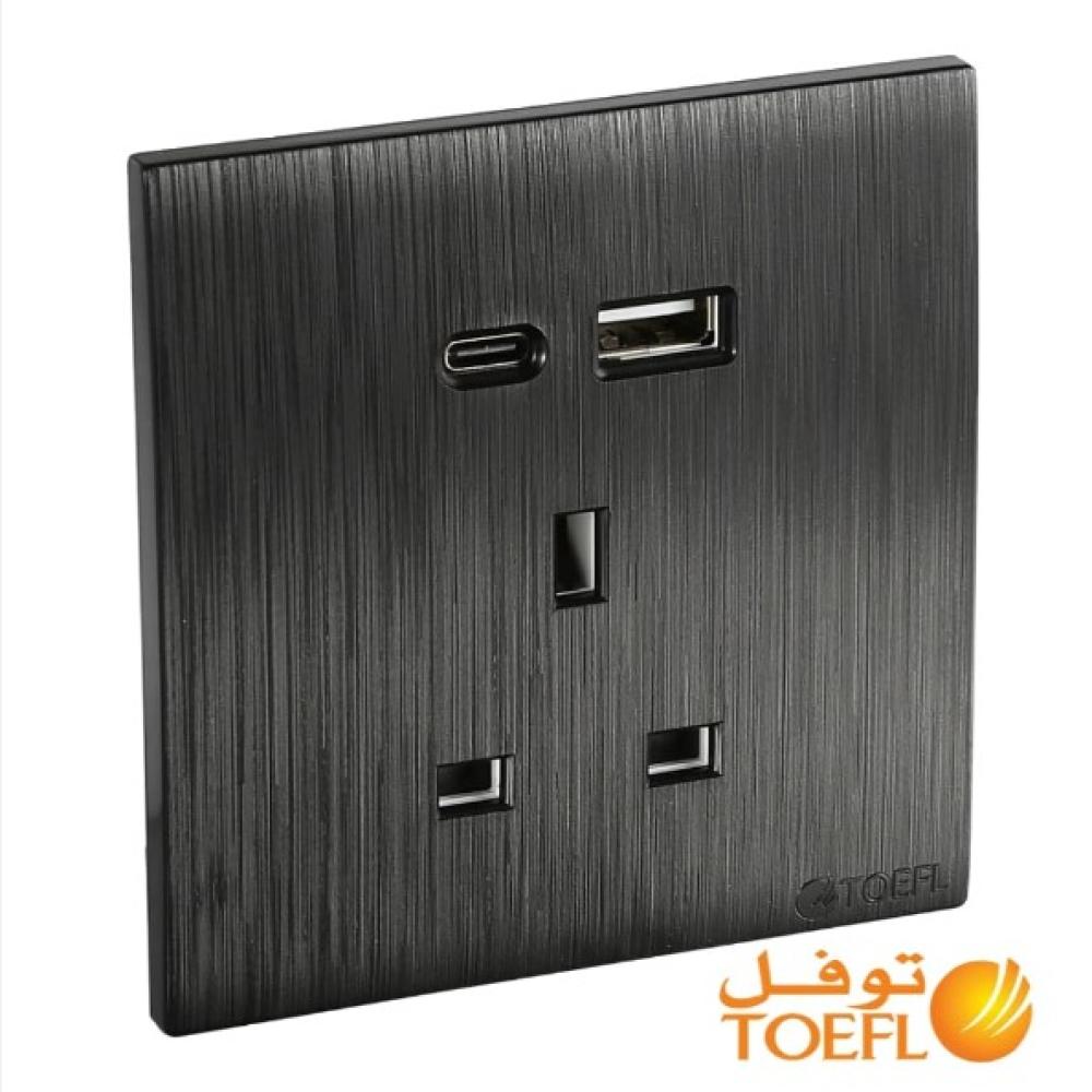 فيش ثلاثي مع منفذ يو اس بي USB مع تايب سي TYPE-C اسود بيانو بلاتيني